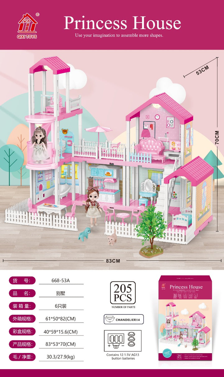 La Casa de Muñecas Princess House Ref. 668-53A es un encantador juguete que combina elegancia, creatividad y diversión. Con 205 piezas, las niñas podrán construir una hermosa casa de dos niveles, con habitaciones totalmente decoradas, terraza, escaleras, jardín y muñecas incluidas.