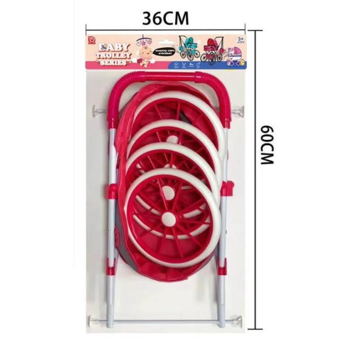Coche para muñecas con estructura metálica plegable. Diseño moderno en tonos rosa y gris, ideal para juego de imitación.