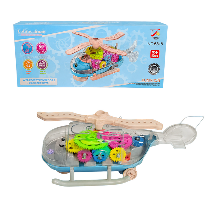 Un juguete lleno de diversión y aprendizaje. Este helicóptero cuenta con un diseño transparente que permite ver sus engranajes de colores en movimiento, estimulando la curiosidad y la imaginación de los niños.