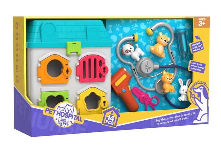Un tierno hospital de mascotas para que tu peque cuide, revise y juegue a ser veterinario con sus animales favoritos.