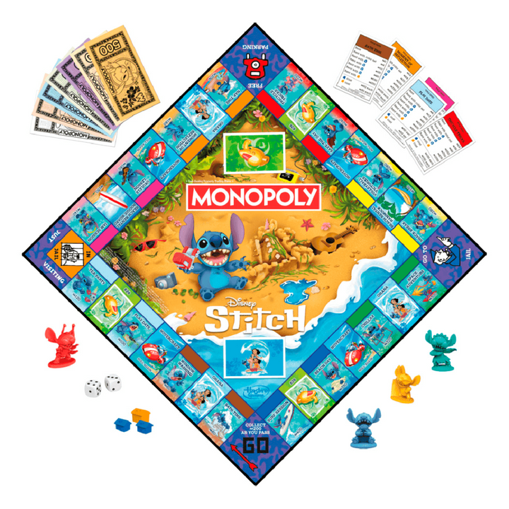 ¡Crea un día perfecto con Stitch en el juego de mesa Monopoly Edición Disney Stitch! En esta edición, las propiedades son remplazadas por actividades favoritas de Stitch, como un Espectáculo de Hula y Chillax, así como artículos de alquiler en la playa. Primero, cada jugador elige un peón único de Stitch.