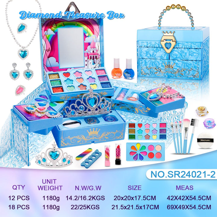 El Blue Diamond Treasure Box convierte cualquier tarde en una aventura llena de fantasía, colores y creatividad. Su diseño azul tipo cofre cristalino abre compartimentos mágicos donde tu niña encontrará sombras, glitter, esmaltes, labiales, brochas, joyería infantil y una corona azul digna de una princesa real.