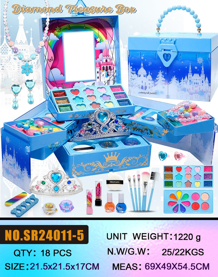 Si tu hija ama jugar a las princesas, este Diamond Treasure Box será su tesoro favorito. Un maletín mágico lleno de sombras, brillos, joyería y accesorios que despertarán su creatividad mientras juega a maquillarse como en un cuento de hadas. Todo viene organizado dentro de una hermosa cajita tipo castillo, perfe para llevar a cualquier parte.
