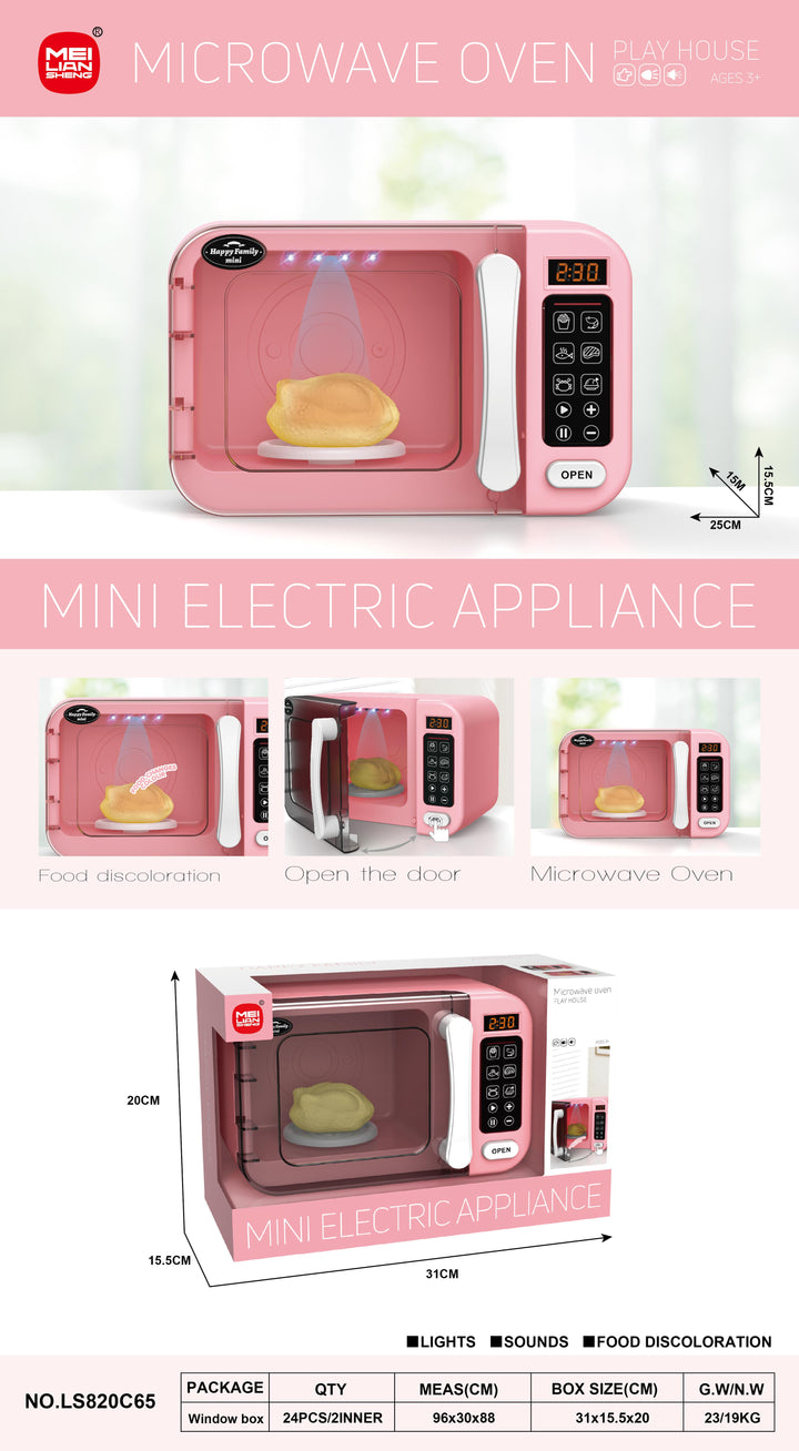 Interés: Incluye luces reales, sonidos, botón de apertura, pantalla simulada, plato giratorio y comida de juguete que cambia de color al calentarse. Su diseño rosa brillante y tamaño compacto lo convierten en un complemento perfecto para cualquier cocina infantil. Importado, seguro y súper entretenido.