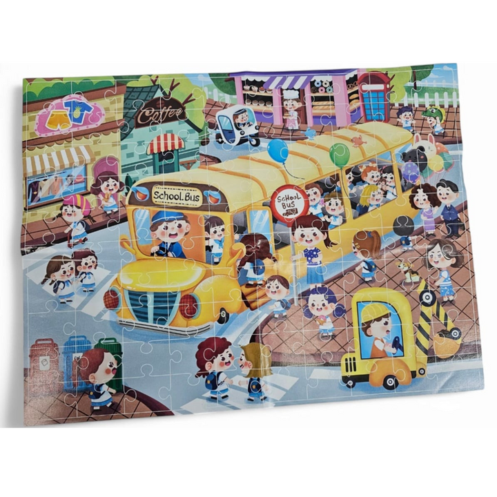 ¡Acompaña a los niños en su camino al colegio! Este colorido rompecabezas representa una divertida escena escolar con buses, estudiantes, maestros y edificios llenos de vida.