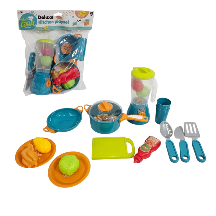 ¡Lleva la diversión a la cocina con este completo set de juego! Perfecto para pequeños chefs que disfrutan imitar a los grandes. Incluye todo lo necesario para preparar platillos imaginarios: licuadora, olla, sartén, utensilios, alimentos, platos y más.
