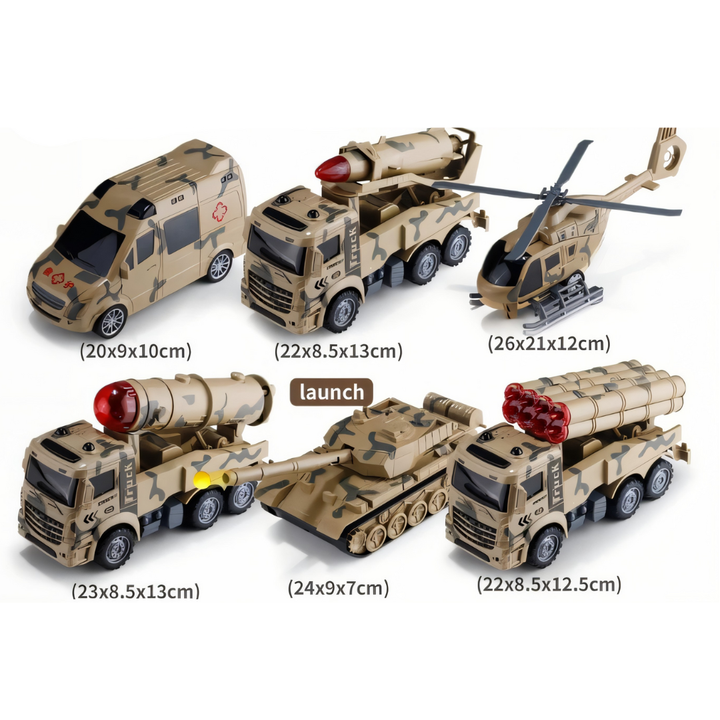 Incluye 6 vehículos militares con diseño de camuflaje, como tanque, camión lanzamisiles, helicóptero y ambulancia táctica.