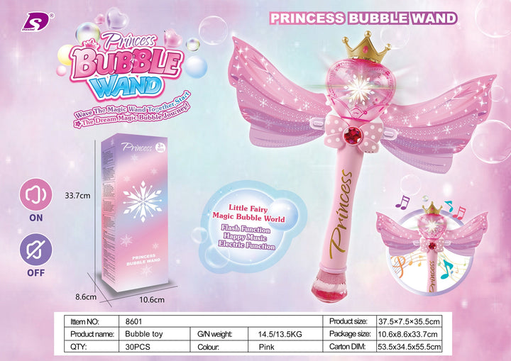 La Princess Bubble Wand es la varita mágica que toda niña sueña tener. Con solo presionar un botón, la varita ilumina, toca música y lanza burbujas brillantes que llenan el ambiente de magia y diversión.