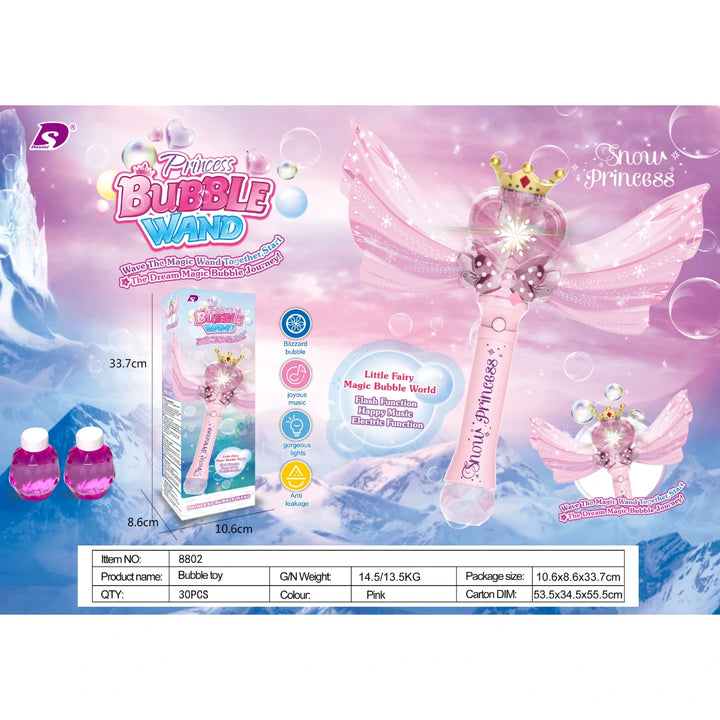 La Princess Bubble Wand 8802 Snow Princess es la varita soñada para niñas que aman la magia. Con solo presionar un botón, crea un efecto de burbujas tipo nevada, mientras se iluminan sus alas brillantes y suena música alegre que llena el ambiente de fantasía.